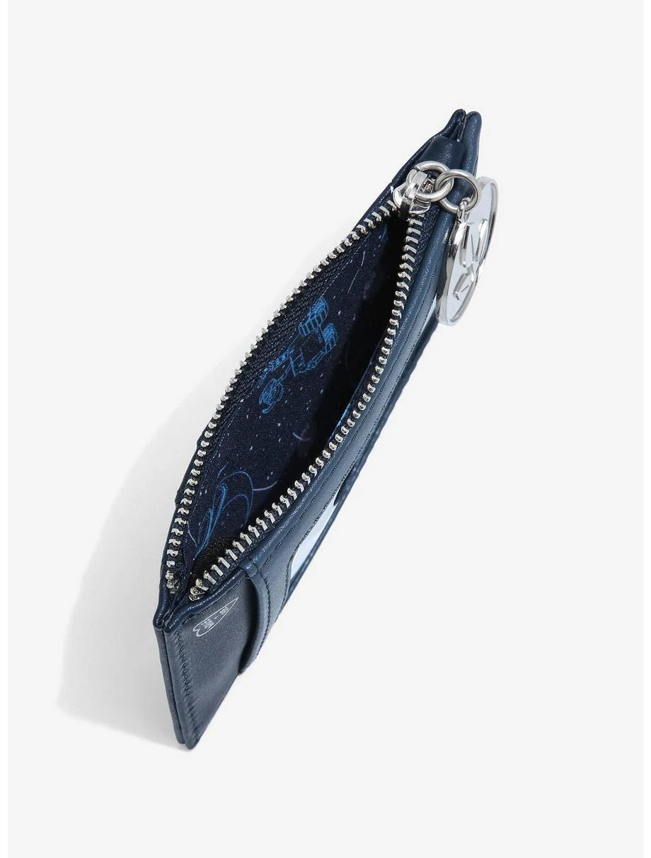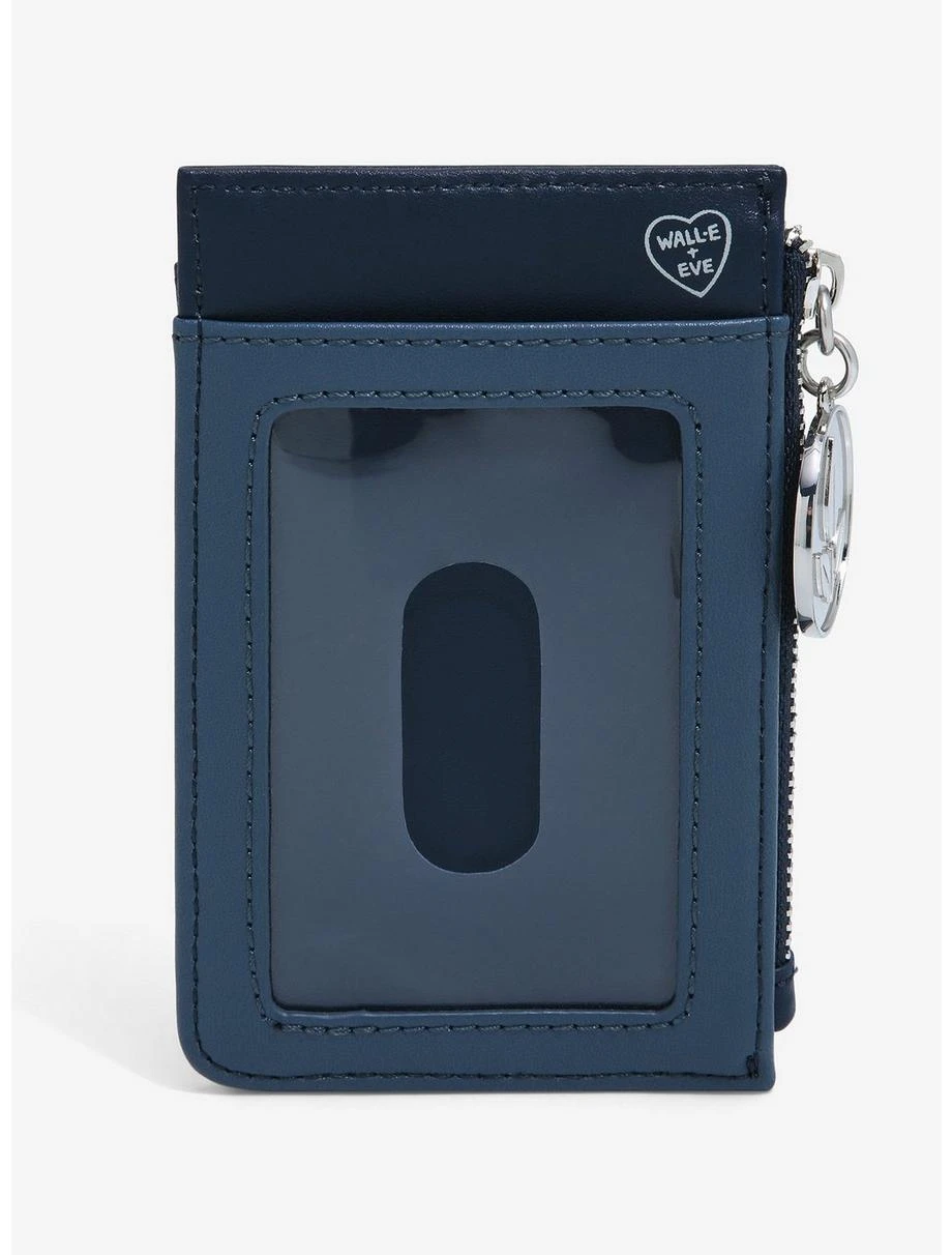 Take your accessory game to out-of-this-world levels of style with this Disney•Pixar cardholder from Loungefly! Inspired by the scene from WALL•E where he and EVE fly through space, the robot duo appear as a die-cut appliqué, surrounded by dotted heart-shaped details. Also features four card pockets, a clear ID sleeve, silver-toned hardware, and an enamel zipper pull of EVE’s plant logo indicator.